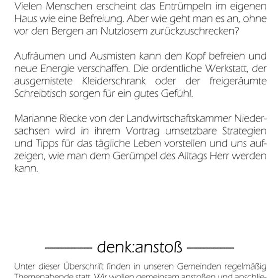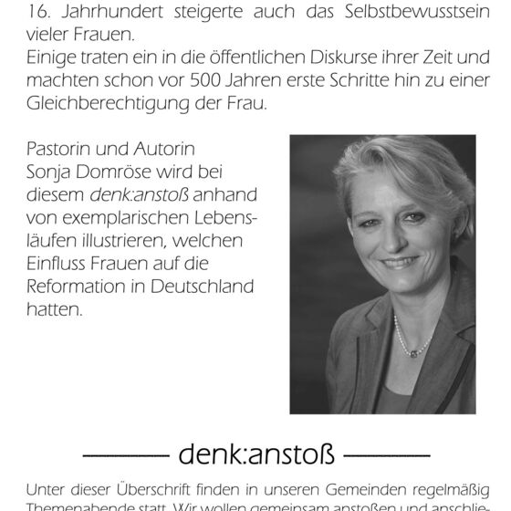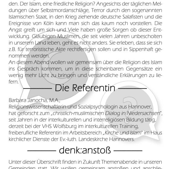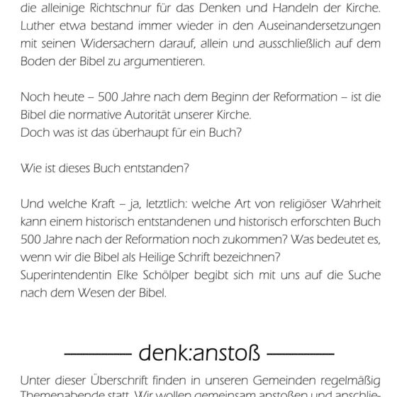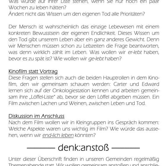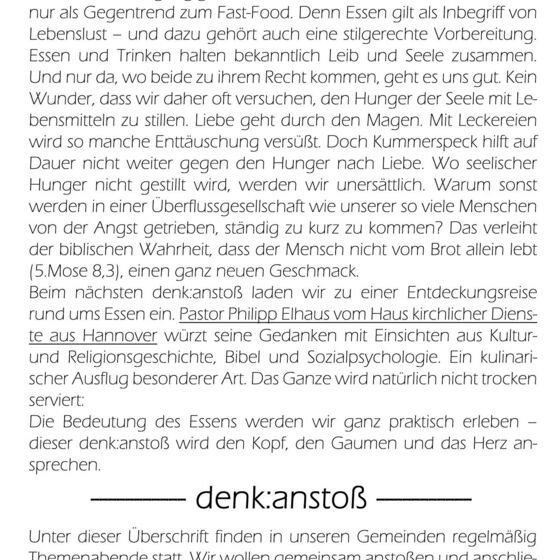Neben dem sogenannten „Moment im Advent“, dem Freiluftkino im Kirchengarten oder auch der Lagerfeuermusik beim Gemeindehaus gibt es etwa zwei- bis dreimal im Jahr einen „denk:anstoß“. Unter dieser Überschrift finden Themenabende statt, an denen wir gemeinsam anstoßen und uns zum Denken anstoßen lassen wollen.