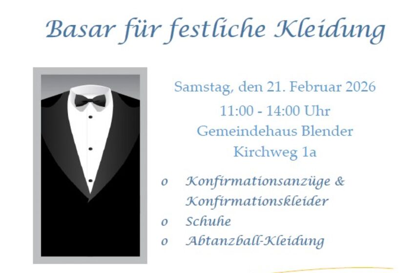 Am Samstag, den 21. Februar wird in der Zeit von 11:00 bis 14:00 Uhr im Gemeindehaus Blender eine Kleiderbörse für junge Leute angeboten. Verkauft werden feierliche Anzüge und Kleider, die für ...