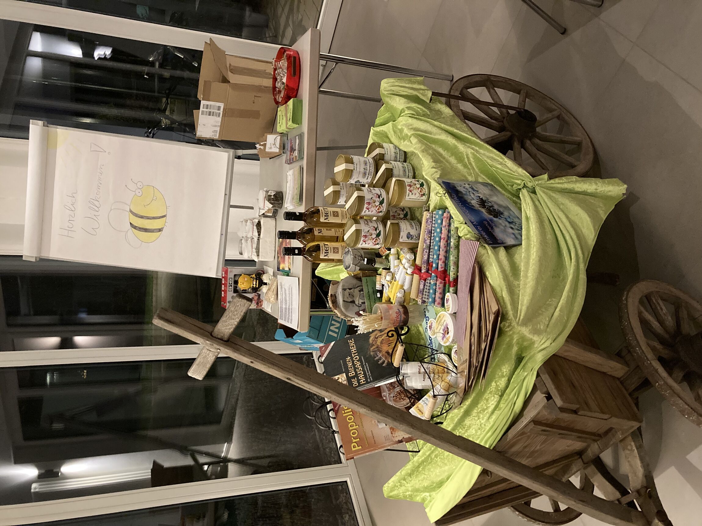 Im Anschluss an den Vortrag stand der Referent gern bereit für Erklärungen, wie man zum Beispiel eine einfach Nisthilfe für zu Hause bauen kann. Birgit Gumz hatte einen dekorativen Holzkarren dabei, an welchem sie verschiedene Bienenprodukte aus Wachs und Honig anbot wie Blumensamen, Brotaufstriche, Hautcremes, Lektüren und Getränke wie Met und Bärenfang. Letztere beiden wurden auf Wunsch auch zum Probieren ausgeschenkt.