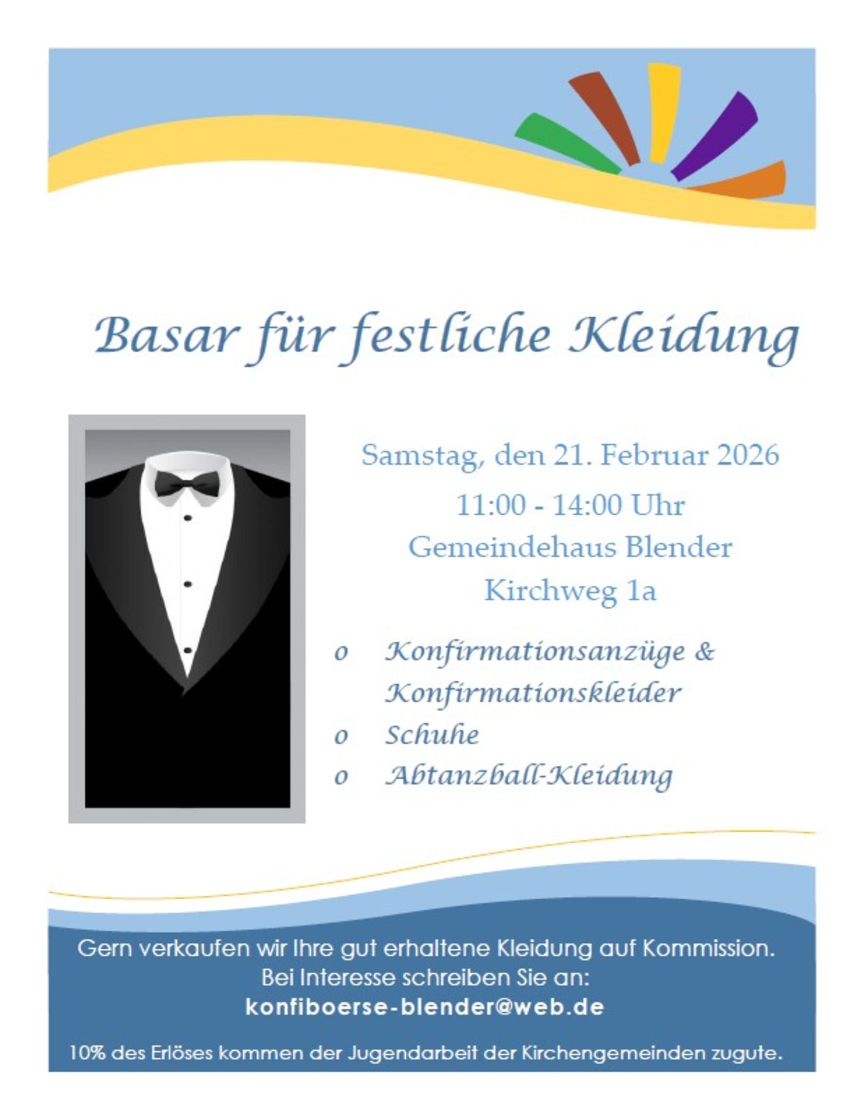 Bevor die Schnäppchenjagd beginnen kann, braucht es ein gutes Sortiment. Wer gut erhaltene, stilvolle Anzüge oder Kleider verkaufen möchte, kann dies auf Kommission tun. Dafür wird bitte Kontakt unter konfiboerse-blender@web.de aufgenommen. 10% der Erlöse kommen der Jugendarbeit der Kirchengemeinden zugute.