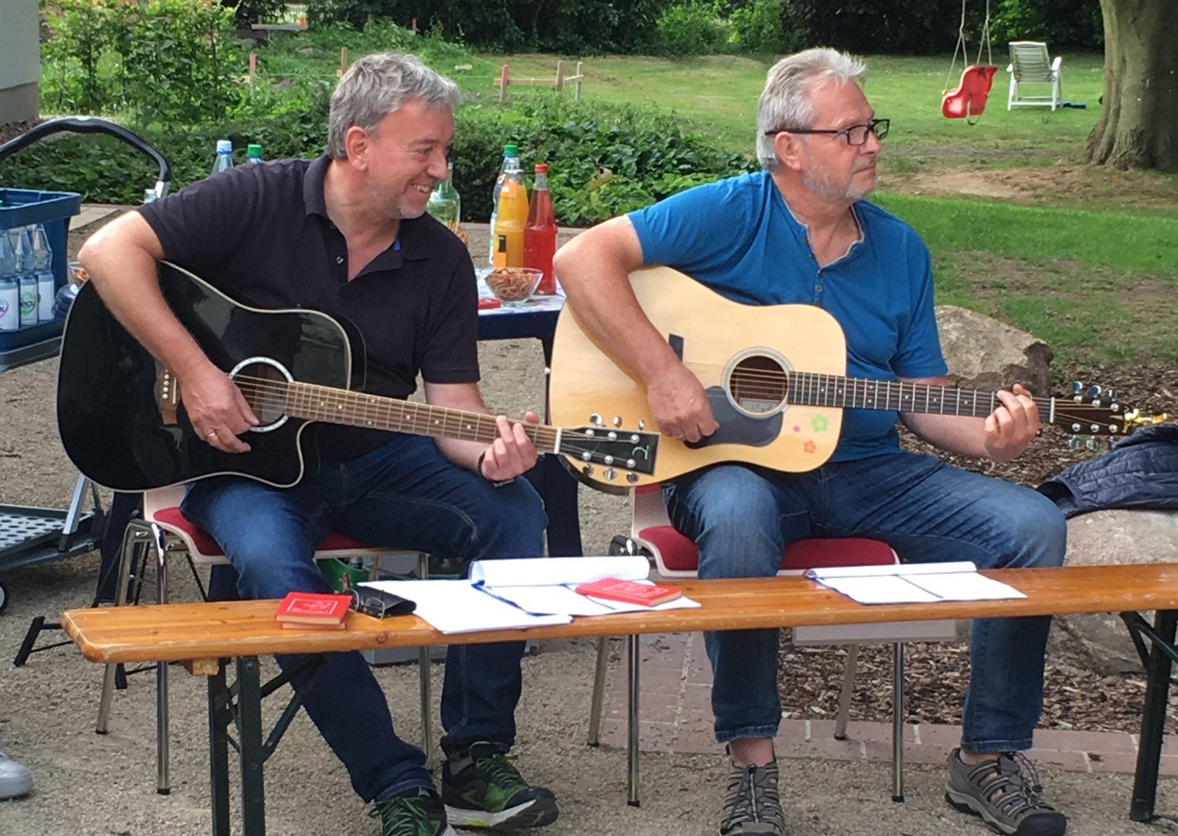 Jens Riepe, der sich als musikalische Begleitung mit der Gitarre vorbereitet hatte, wurde von Karsten Lotze unterstützt, welcher kurzfristig gebeten worden war, sein Instrument auch mitzubringen und von dem man wusste, dass er in Sachen Hausmusik bewandert ist.