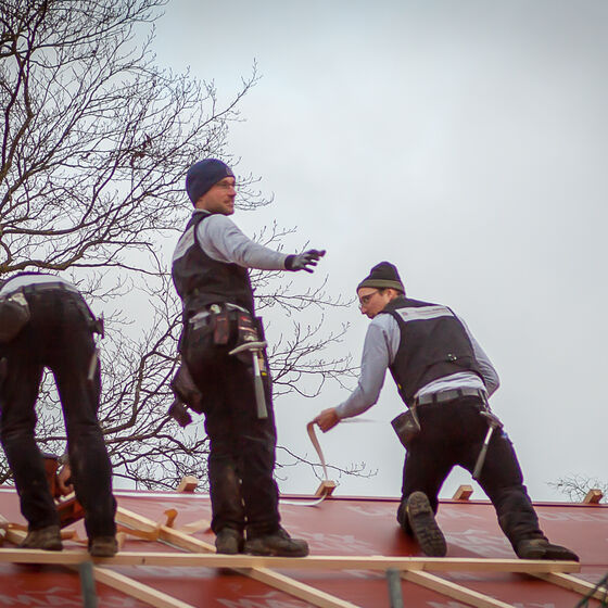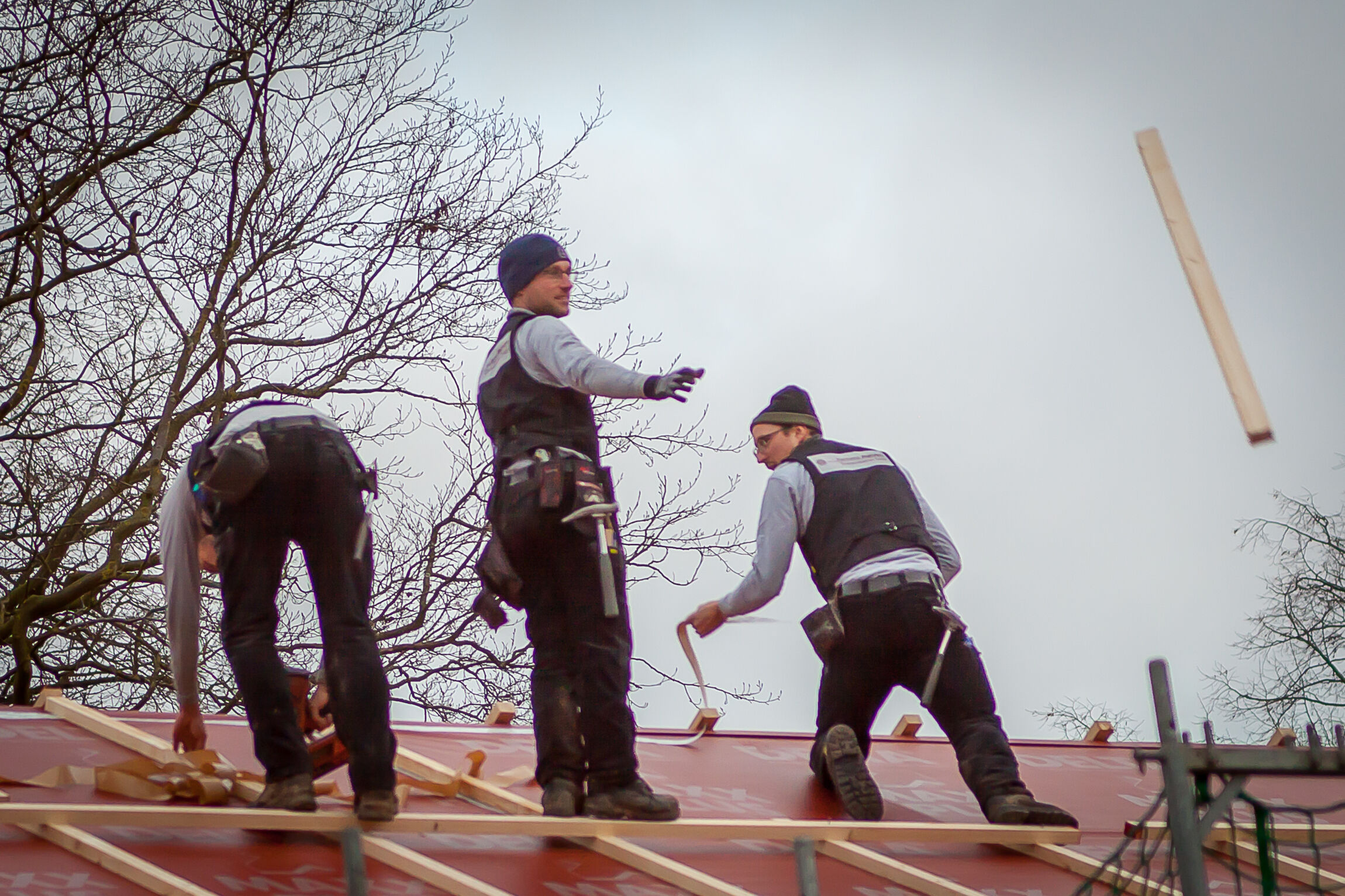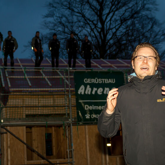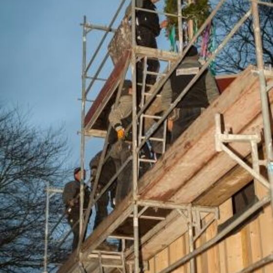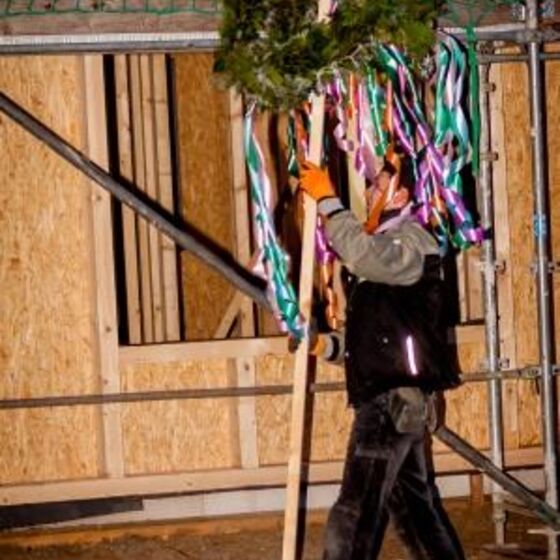 Noch in den letzten Minuten vor dem Richtfest brachten die Zimmerleute die letzten Folien aufs Dach und schlugen die letzten Nägel ein. In einem beeindruckenden Tempo gingen die letzten Handgriffe von statten.