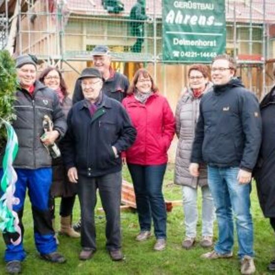 Als der Richtkranz hing und der Richtspruch gesprochen war, gab es kurze Worte des Danks und der Freude von Pastor Sebastian Sievers, Architektin Ute Asendorf und Superintendentin Elke Schölper. Anschließend waren die Gäste zur Besichtigung des neuen Hauses und zum Beisammensein ins alte Gemeindehaus eingeladen. Hier kam man ins Gespräch und trank das ein oder andere Getränk.