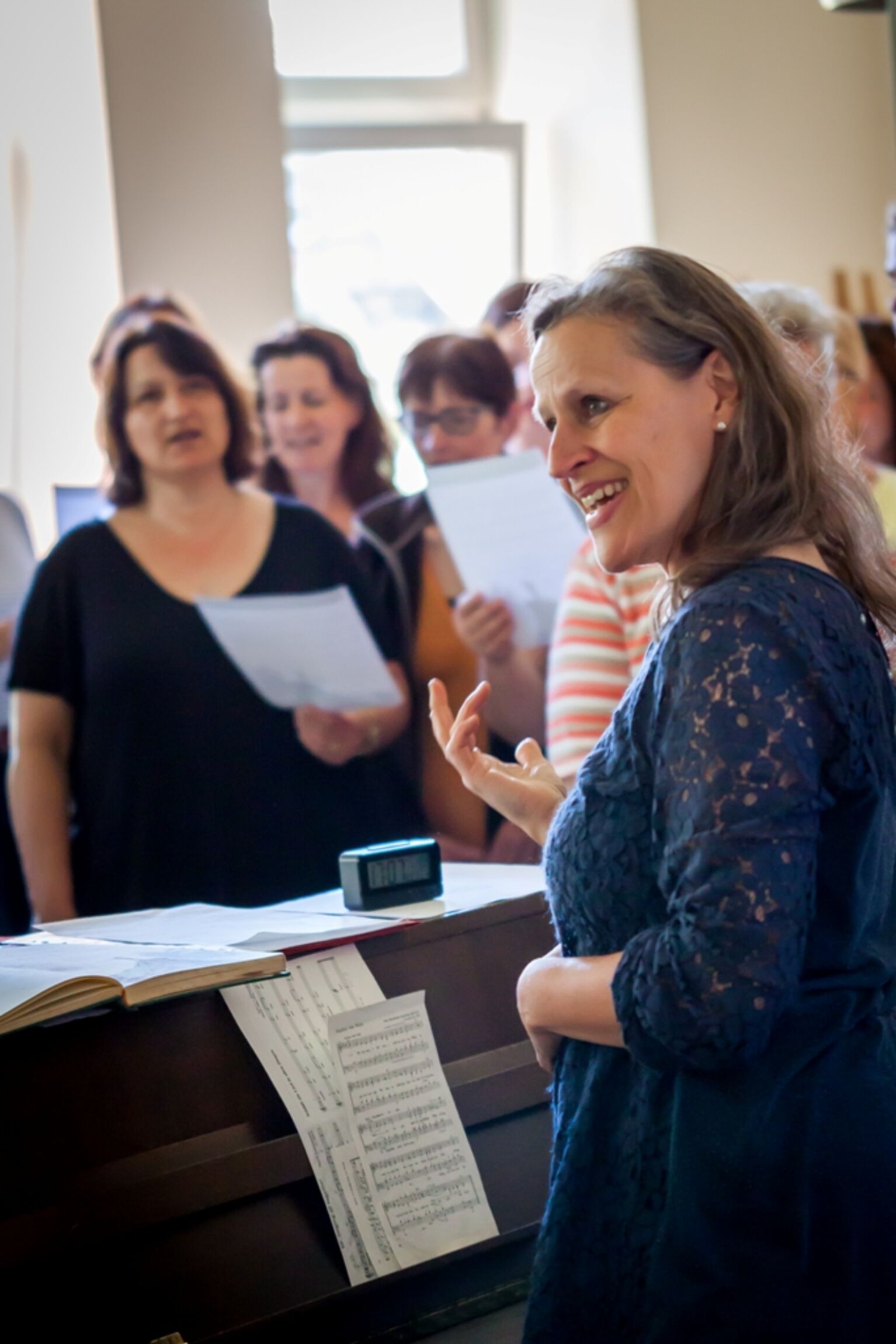 Kurz nach halb vier ging es dann los: Katharina Rikus (studierte Altistin und Lehrkraft an der Hochschule für Künste in Bremen) und Assistentin Susanne Shehata (Chorleiterin des gemischten Chores Polyhymnia) stellten sich kurz vor und dann startete eine voll motivierte, mit ansteckender Gesangsfreude ausgestattete Katharina in die Vollen: es wurde ge-zzzzzzzzz, ge-ppppppppp und ge-ttttttttt, um die Mundmuskulatur zu lockern.